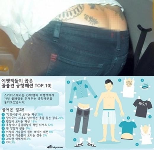 여행 비교검색 사이트 스카이스캐너는 지난 여행객 2,700명을 대상으로 ‘꼴불견 공항패션’이라는 이색 설문조사를 실시한 결과 1위로 28%가 ‘엉덩이 골이 보이는 패션’이라고 답했다.