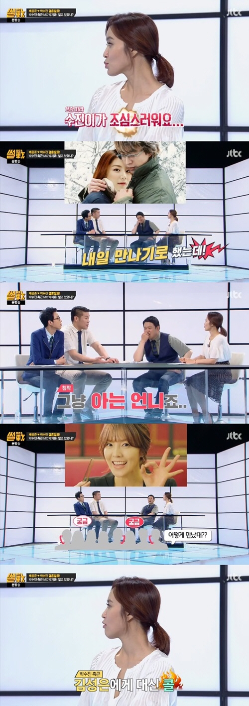 21일 방송된 JTBC ‘썰전’에서 박지윤은 “(박)수진이랑 알고 지낸 지는 좀 됐다. 내일도 만나기로 했는데 결혼 소식을 들은 뒤엔 나도 조심스럽다”고 밝혔다.