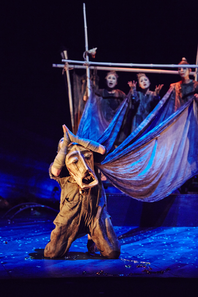 연극 ‘노래하듯이 햄릿’에서는 망자의 구천을 배웅하는 역할을 하는 네 명의 요정들을 통해 햄릿과 햄릿을 둘러싼 이야기가 전개된다. 햄릿의 이야기는 요정들의 몸을 통해 직접적으로 드러나는 것이 아니라 대부분의 장면들은 나무 가면을 통해 구현된다. 요정 역을 맡은 배우들의 손에 들린 나무 가면은 한국의 탈과 비슷하다. 이때 등장하는 가면들은 다양한 형태로 조정된다. 배우들은 손으로 가면을 조정해 인형극과 같은 모습을 연출하기도 하고 얼굴에 쓰기도 하며, 발에 탈을 끼워 가면극을 올렸던 조선 후기 발탈과 흡사한 무대 연출을 보여주기도 한다. 게다가 가면은 각기 다른 색채의 천을 연결하여 각 인물을 인형과 같은 형상으로 만들어 등장시켰는데 이는 인물이 처한 현실과 인물의 정서를 강화하는데 일조한다. 이렇게 만들어진 인형의 미장센은 조명과 조화되어 장면의 분위기를 고조시킨다. 가장 대표적 장면은 물에 빠져 죽은 오필리어의 영혼이 구천을 떠도는 장면이다. 이 장면에서 등장한 오필리어는 하얀색의 긴 천을 연결한 인형으로 등장한다. 장면에서는 이 인형을 낚시줄에 매달아 돌려 유령이 구천을 떠도는 듯한 그로테스크한 분위기를 조성한다.