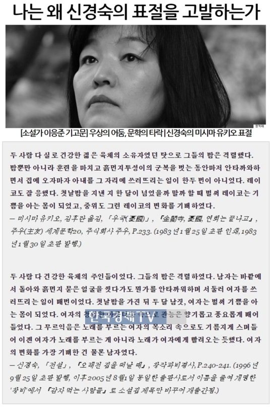 소설가 이응준 씨(45)는 16일 인터넷매체 허핑턴포스트코리아에 기고한 ‘우상의 어둠, 문학의 타락-신경숙의 미시마 유키오 표절’이란 글에서 신경숙 씨가 1996년 발표한 단편 ‘전설’이 미시마의 ‘우국(憂國)’을 표절했다고 주장했다.