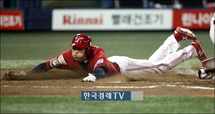 ▲ KIA 김호령이 5회초 무사 2,3루 김민우의 2루 플라이 때 홈을 파고들어 득점을 올리고 있다.(사진 = KIA 타이거즈)