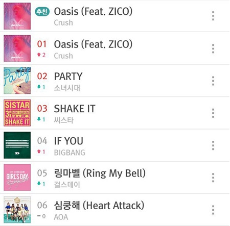 크러쉬의 신곡 `오아시스`는 공개와 동시에 올레, 지니, 엠넷 1위 및 멜론 5위, 벅스 6위, 네이버 뮤직 9위 등을 차지하며 소녀시대, 걸스데이, 씨스타, 에이오에이(AOA) 등 강력한 걸그룹들이 포진되어 있는 음원 차트 상위권에 당당히 안착, `차트 이터`의 별명을 입증했다.