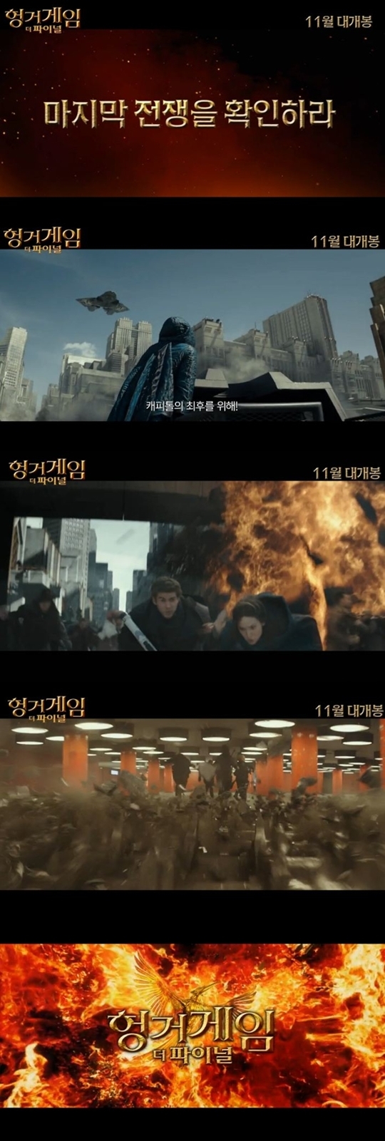 또한 “마지막 전쟁을 확인하라”라는 카피와 함께 캐피톨로 뛰어든 캣니스가 이전 헝거게임과 비교할 수 없을 정도로 위험한 장애물들과 맞서는 장면들이 연이어 등장해 화려하고 스펙터클한 헝거게임이 펼쳐질 것으로 보인다.