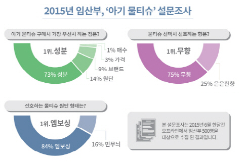 그 결과, 구매시 가장 우선시 하는 점은 응답자의 73%가 성분이라고 응답했다. 뒤를 이어 원단(14%), 브랜드(9%), 가격(3%), 매수(1%) 순으로 나타났다. 예비맘들이 성분을 가장 중요한 조건이라고 꼽은 것은 지난해 발생했던 물티슈 유해성 논란이 원인인 것으로 풀이된다.