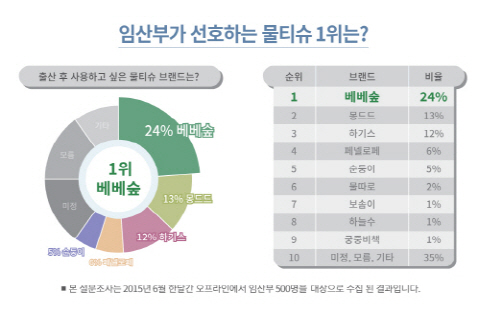 지난 6월 한달간 오프라인에서 임산부 500을 대상으로 진행한 아기물티슈 관련 설문조사는 아기물티슈 구매시 가장 우선시하는 점, 물티슈 선택시 선호하는 향, 선호하는 물티슈 원단형태, 출산 후 사용하고 싶은 물티슈 브랜드, 구매장소, 구매영향에 대한 질문으로 설문조사가 이뤄졌다.