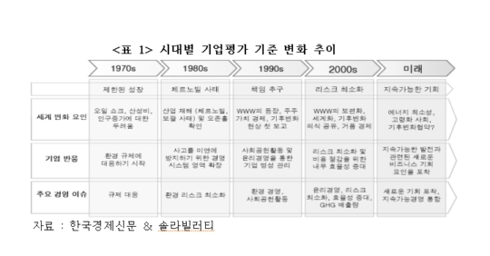 금융위기 이후 기업평가 잣대가 달라지고 있다. 과거 기업을 평가하는 주요 지표는 재무제표였다. 경영진은 경제적인 이윤 추구에 집중하고 투자자들은 매출과 이익을 근거로 우량 기업을 골라내는 것이 정형화된 기준이었다. 주가의 적정성을 따지는 방법도 주가수익비율(PER), 주가순자산비율(PBR) 등 주로 재무제표와 관련한 지표였다.