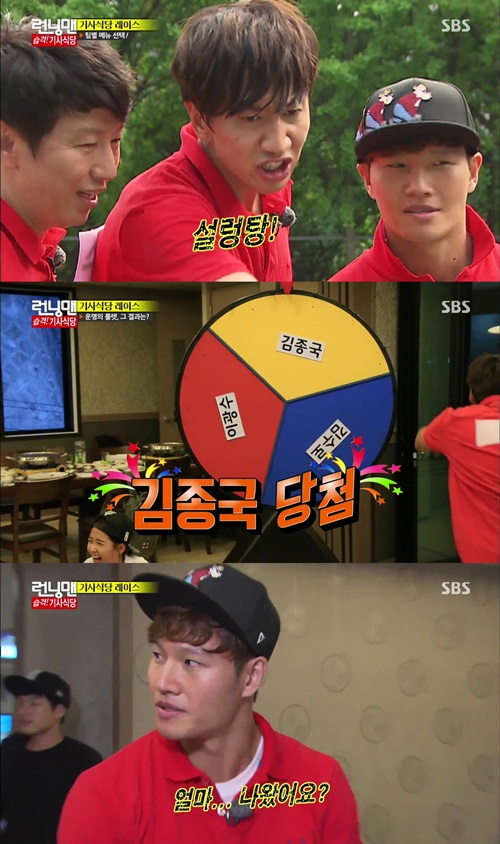 이광수 팀은 다른 팀이 2-3끼를 먹을 동안 제육볶음, 오징어불고기, 삼계탕 등 5끼나 먹고 최종 미션장소에서 제일 늦게 도착했다. 이후 회식비를 책임 질 룰렛을 돌렸고, 룰렛의 주인공은 김종국이 됐다.