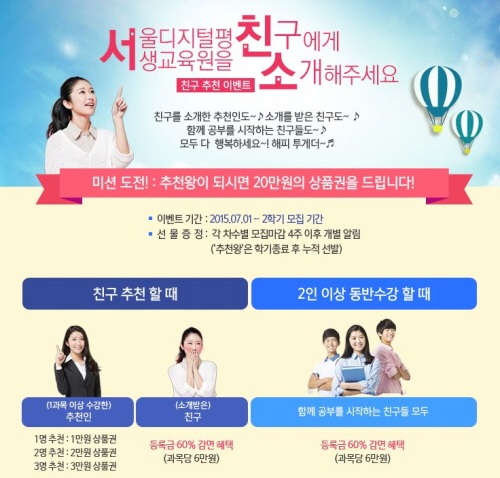이벤트에 참여한 추천인에게는 추천 친구 1명당 1만원 상품권을 증정하고 소개받은 친구와 동반수강생들에게는 등록금 60% 감면혜택을 제공해 3학점짜리 과목을 6만원으로 수강할 수 있다. 또한 한 학기 전체를 통틀어 가장 많은 친구를 추천한 ‘추천왕’에 선발되면 20만원의 상품권이 수여된다.