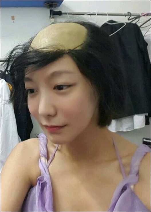공개된 사진 속 신소율은 정수리 부분에 머리카락이 없는 대머리 가발을 쓰고 있다. 낯선 모습이지만, 귀여운 미모로 시선을 모으고 있다.
