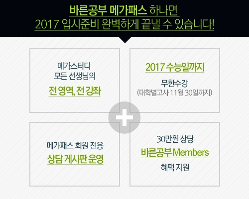 메가스터디교육의 고등부 사이트 메가스터디(www.megastudy.net)가 내년도 대입 대비 바른 가격으로 입시의 완성을 지원하는 `2017 바른공부 메가패스`를 최근 오픈, 오는 11월11일까지 신청받는다고 밝혔다.