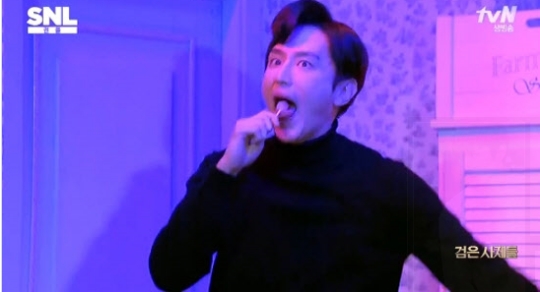 ▲ `SNL` 권율, `검은 사제들` 패러디에서 현란한 혀놀림 `폭소!` (사진=tvN `SNL코리아6` 방송화면 캡처)