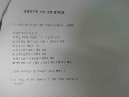 여야가 마련한 `관광진흥법 개정 관련 합의내용`에 따르면 관광진흥법은 앞으로 5년간 서울·경기 지역에 한해 절대정화구역을 기존 50m에서 75m로 확대해 이 구역을 벗어나면 학교정화위원회의 심의를 거쳐 호텔을 지을 수 있도록 했습니다.