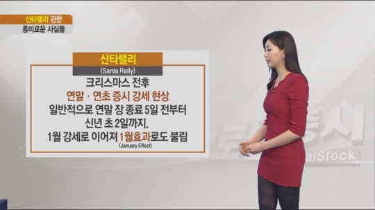 먼저 산타랠리는, 크리스마스를 사이에 두고 연말과 연초에 증시가 강세를 보이는 현상인데요. 일반적으로는 연말 장 종료 닷새 전부터 신년 초 2일까지, 총 7거래일 정도의 기간이구요. 1월 증시의 강세로까지 이어지는 경우가 많아서 1월효과라고 불리기도 합니다.