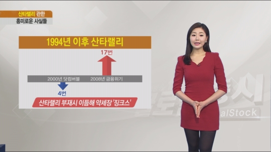 그런데 이 산타랠리가 나타나지 않으면 그 이듬해에 약세장이 이어지는 경우가 많아지면서, 시장에서는 내년 시장 상황을 가늠하는 척도로도 산타랠리가 활용되고 있는데요. 1994년 이후 지난 21년동안 미국 증시에서는 단 4번만 산타랠리가 찾아오지 않았구요. 나머지 열일곱번은 산타랠리가 이어졌습니다.
