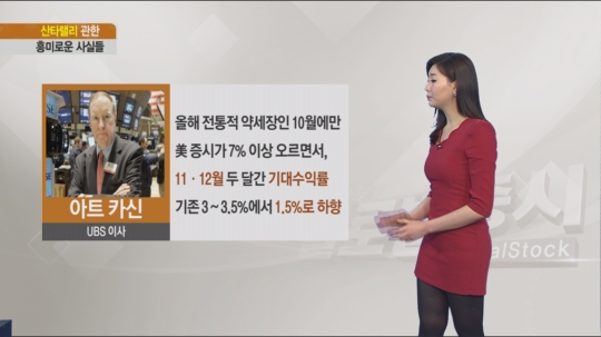 이런 맥락에서 글로벌 금융기업 UBS의 아트 카신 이사는, 올해 10월 랠리에 따라 산타랠리는 부진할 것으로 전망하면서, 올해는 전통적으로 약세장인 10월에만 미국 증시가 7% 이상 오르면서 11~12월 두달간 기대수익률이 기존 3~3.5%에서 1.5%로 반토막이 날 수 있다고 진단했습니다.