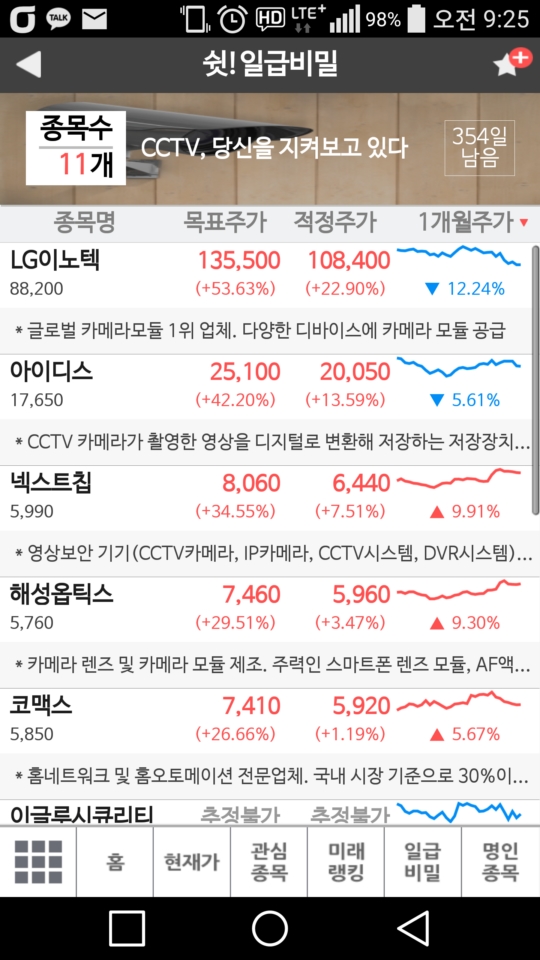 한국경제TV 미래주가 앱 유료회원 전용 컨텐츠인 일급비밀 컨텐츠 중 CCTV와 관련된 종목과 미래주가 예상치를 확인해 본다.