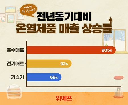 15일 소셜커머스 위메프에 따르면 1월 1일부터 14일까지 약 2주간 가습기와 온수매트, 전기매트 매출액을 조사한 결과 전년 동기대비 최대 205% 매출 상승을 보였다. 2015년 1월 1일부터 14일과 2016년 동기간을 조사한 데이터로 온수매트가 205%, 전기매트가92%, 가습기가 68% 상승한 것으로 나타났다.