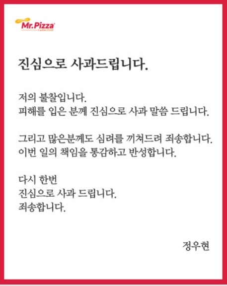 4일 미스터피자는 자사 홈페이지에 정우현 MPK그룹 회장 명의 사과문을 올려 눈길을 끌었다.