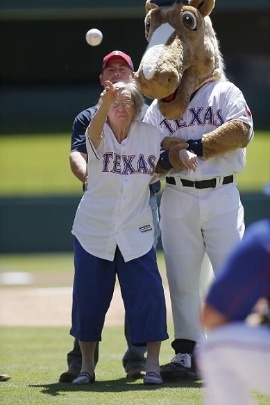 휠체어를 타고 마운드로 간 설리번은 텍사스 구단 마스코트의 부축을 받아 일어났고, 힘차게 공을 던졌다.