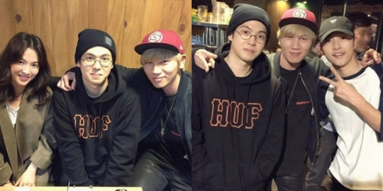 사진 속 매드클라운과 케이윌은 송혜교 옆에서 수줍어 하고 있다. 반면 송중기와는 어깨동무를 하고 자연스러운 포즈를 취했다.
