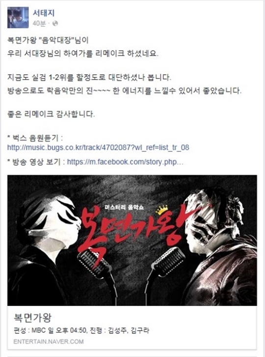 서태지컴퍼니에서 운영하는 서태지 공식 페이스북에도 “방송으로도 락음악만의 진~~한 에너지를 느낄수 있어서 좋았습니다. 좋은 리메이크 감사합니다”라고 밝히며, 음원 링크를 첨부해 더욱 화제가 되고 있다.