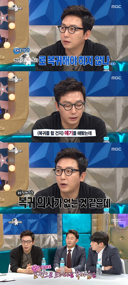 `라디오스타` 탁재훈은 20일 방송된 MBC `황금어장-라디오스타`에서 "S(신정환)와 만나서 무슨 얘기를 했냐. 복귀 하는 것이냐"는 질문을 받았다.