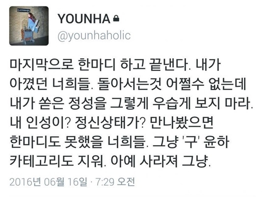 윤하는 16일 새벽 자신의 트위터에 “마지막으로 한마디 하고 끝낸다. 내가 아꼈던 너희들. 돌아서는 건 어쩔 수 없는데 내가 쏟은 정성을 그렇게 우습게보지 마라. 내 인성이? 정신상태가? 만나봤으면 한마디도 못했을 너희들 그냥 ‘구’윤하 카테고리도 지워. 아예 사라져 그냥”이라며 격한 감정을 드러냈다.