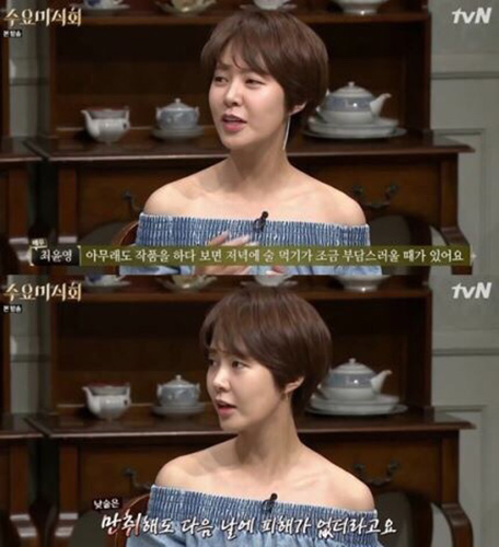 특히 탕요리를 좋아한다고 밝힌 최윤영은 “작품을 하다보면 저녁에 술을 먹기 부담스러울 때가 많아서 낮에 탕 집에 달려가 반주식으로 먹는다”라며 진정한 애주가의 면모를 보이기도 했다.