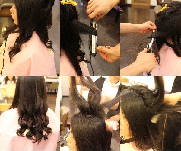 ① 모발 중간부터 아이롱으로 컬을 넣어 줍니다.
