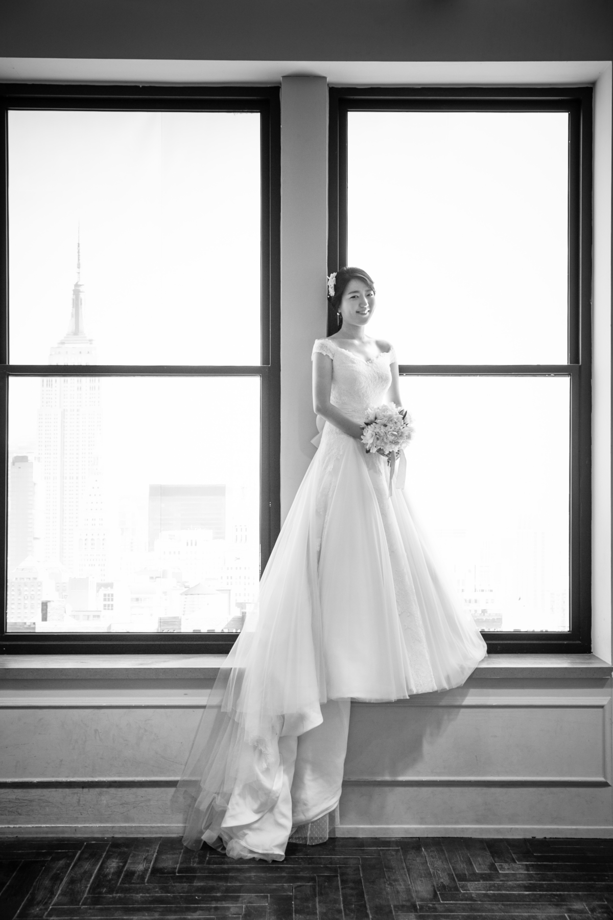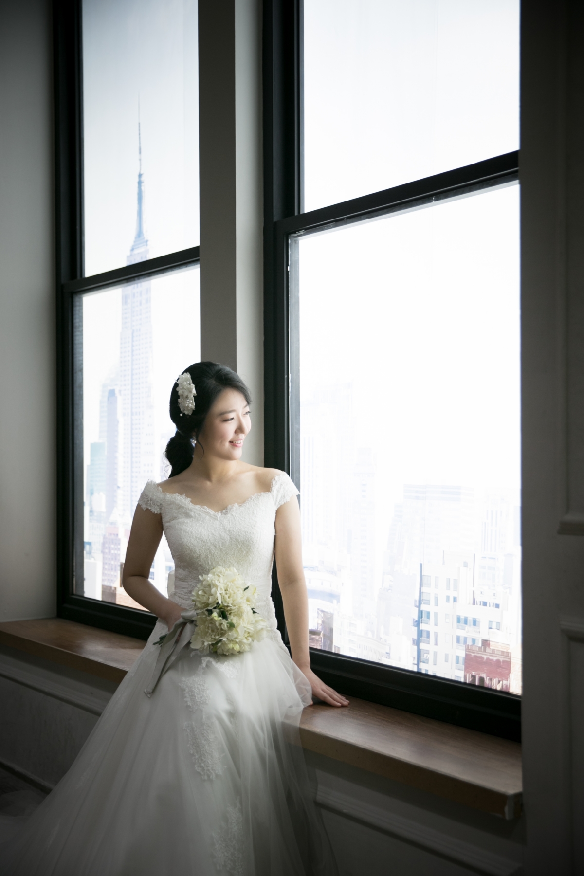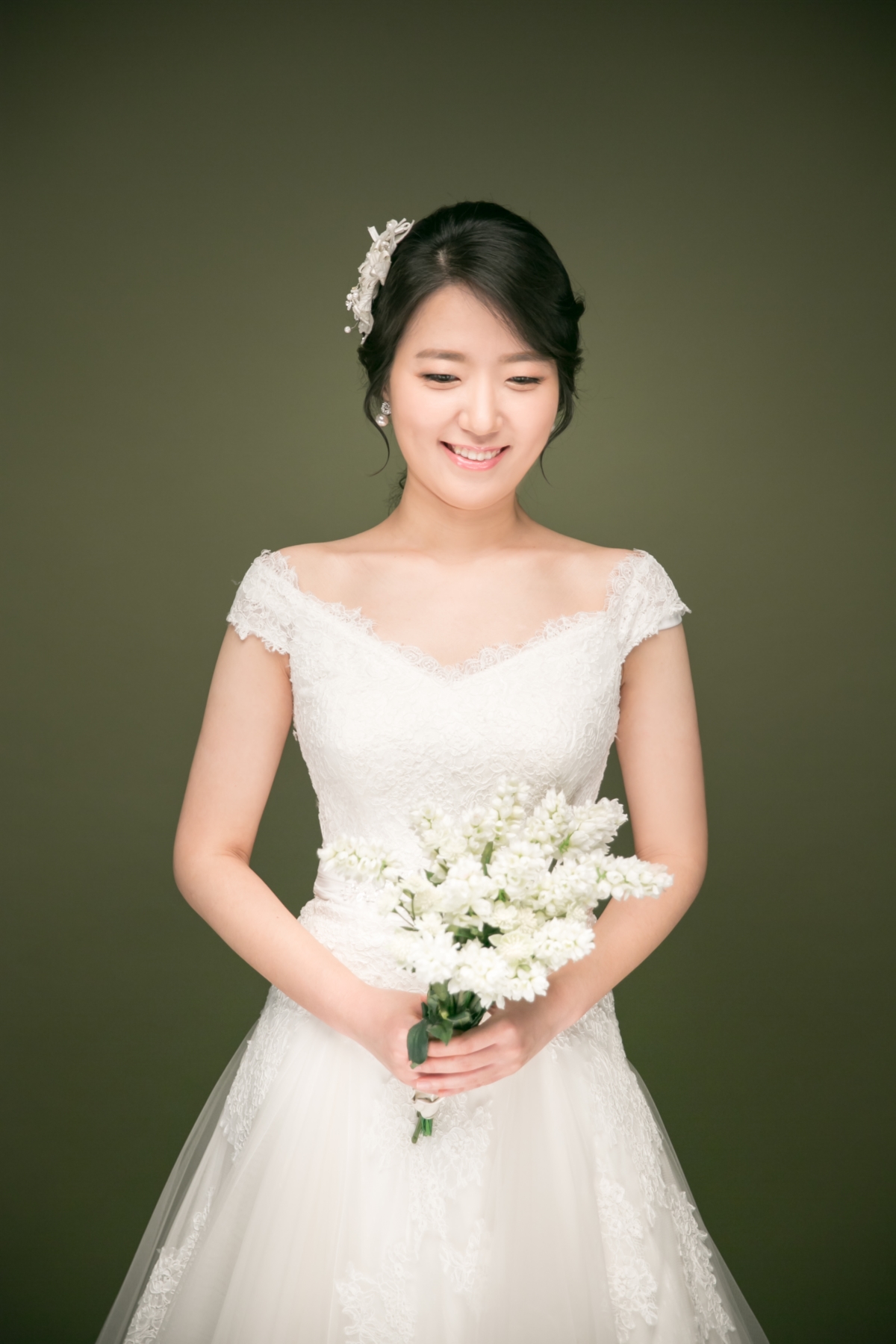 모델은 메이크업과 헤어를 통해 최대한 자연스러운 예비신부 모습을 연출했습니다. 또한 전체적으로 깔끔하고 단아한 느낌을 연출하기 위해 에이라인 드레스를 선택했습니다. 이 드레스는 예비신부가 가장 보편적으로 많이 찾는 드레스로 깔끔하면서 자연스러운 신부모습을 연출합니다. 또한 위에서 아래로 떨어지는 라인이 자연스럽게 이어져 여성스러운 느낌을 한층 더 돋보이게 합니다. 뒤에는 큰 리본으로 포인트가 되어있어 사랑스러운 신부모습까지 함께 연출할 수 있습니다.