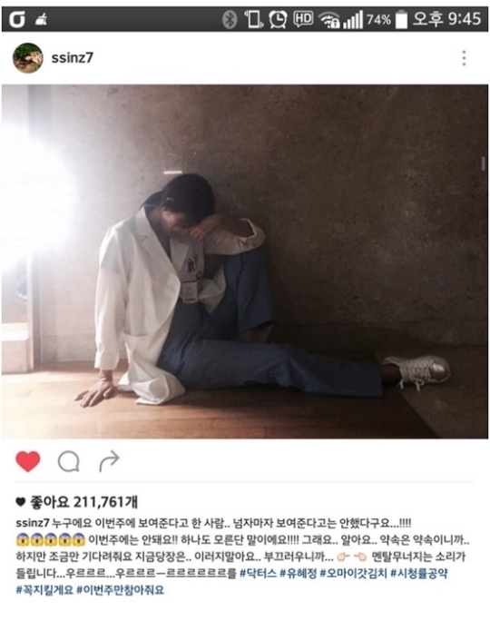 박신혜는 "멘탈 무너지는 소리가 들립니다...우르르르...우르르르ㅡ르르르르르르를 #닥터스 #유혜정 #오마이갓김치 #시청률공약 #꼭지킬게요 #이번주만참아줘요"라고 덧붙였다.