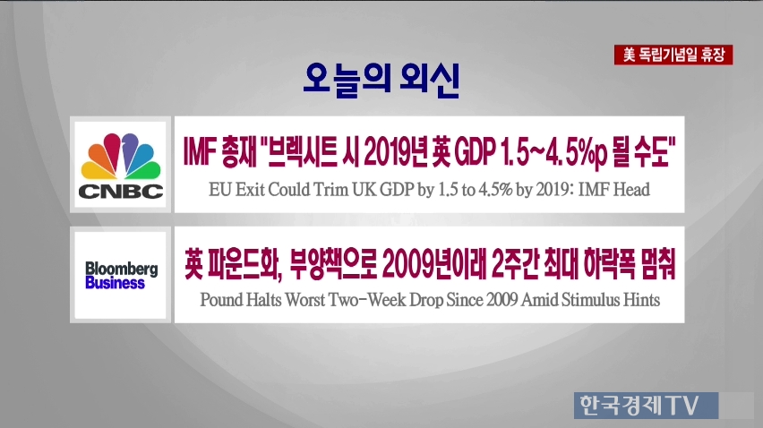 먼저 CNBC에 따르면 라가르드 IMF 총재는 4일 프랑스 신문 르몽드와의 인터뷰에서 브렉시트로 영국의 2019년 GDP 성장률이 1.5%에서 4.5% 사이로 떨어질 것이라고 전망했습니다. 영국의 교역 조건이 WTO를 기준으로 다른 유럽 상대국들보다 악화되는 것을 그 하락 조건이라고 제시했는데요. 한편 라가르드 총재는 최근 한 콘퍼런스에서 유럽연합은 브렉시트 위기를 벗어나 세계에서 주도적인 위치에 올라설 것이라고 전했습니다.현지시간 4일 블룸버그통신은 달러 대비 파운드화 가치가 전 거래일보다 소폭 반등했다고 전했습니다. 독립기념일 연휴를 포함한 미국의 3일간의 휴장 동안 처음으로 파운드화가 오른 모습인데요. 블룸버그에서는 3일 오스본 재무장관이 브렉시트로 인한 후폭풍을 상쇄하기 위해 영국 법인세를 현재의 20%에서 15% 이하로 낮춰 글로벌 기업들이 영국에서 빠져나가는 것을 막겠다는 계획을 밝힌 것이 영향을 줬다고 진단했습니다. 한편 파운드화는 브렉시트 국민투표가 치러진 23일에 비하면 여전히 낮은 수준을 기록하고 있습니다.