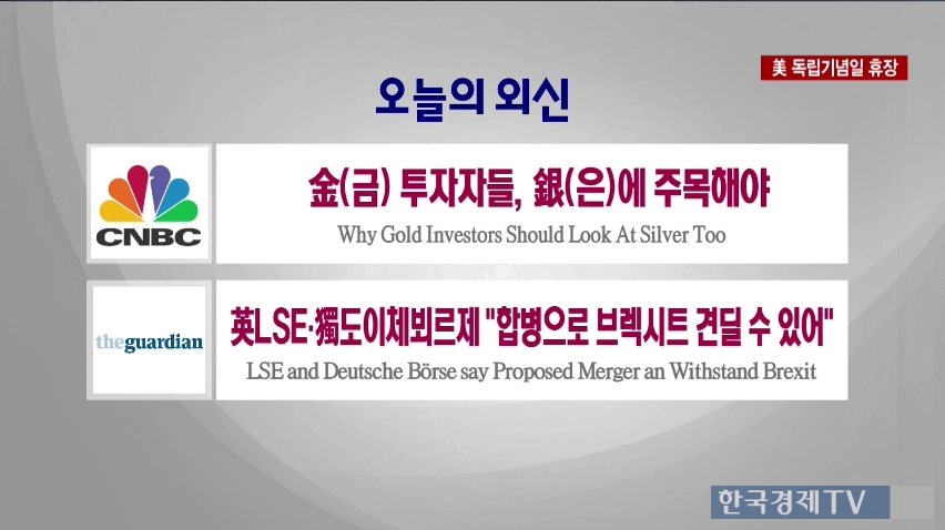 다음 CNBC에서는 금 투자보다 은에 대한 투자가 더욱 좋을 것이라는 의견을 제시했습니다. 브렉시트 국민투표 이후 안전자산에 대한 수요가 높아지면서 귀금속이 주목을 받고 있는 가운데, 월요일장에서는 은 가격이 온스에 21달러를 돌파하면서 지난 2년 동안의 최고치를 기록했다고 전했는데요. 주요 외신들은 중국 선물시장에서 은이 연일 급등세를 보이고 있어 은 가격이 오르고 있다고 설명했습니다. 또 중앙은행들의 완화 정책에 대한 기대가 커지면서, 금리가 하락할 것이란 기대에 은 가격이 뛰고 있다는 분석도 나오고 있습니다.가디언지는 영국 런던증시를 운영하는 런던증권거래소 LSE 주주들의 99.89%가 독일 프랑크푸르트 증시를 운영하는 도이체뵈르제와의 합병안을 승인했다고 보도했습니다. 이번 합병이 이루어지면 양사는 유럽 최대 거래소로 부상할 뿐만 아니라 미국의 CME그룹, ICE그룹 등에 경쟁상대가 되는데요. 다만 합병안이 최종 확정되기 위해서는 도이체뵈르제 주주들의 승인을 포함한 여러 공정 경쟁당국의 승인이 필요합니다. 한편 독일 금융감독청은 합병 후 본사가 런던에 들어서는 것을 반대하고 있어 이번 합병이 무산될 관측도 제기되고 있습니다.