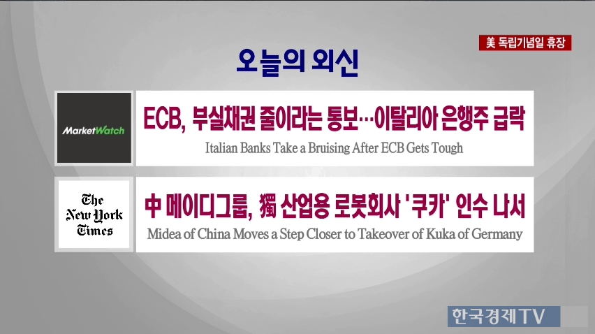 마켓워치는 이탈리아에서 부칠채권 문제가 가장 심각한 방카몬테파스키은행이 간밤 14% 급락했다고 4일 보도했습니다. 유럽중앙은행이 이날 은행에 대해 부실채권을 줄이라는 권고를 했는데요. 최근 이탈리아 은행은 전체 보유분의 3분의 1에 해당하는 규모의 부실채권을 갖고 있어 브렉시트로 인한 경제 위기에서 벗어나지 못하고 있습니다. 외신들은 이탈리아 정부가 EU의 반대에도 불구하고 정부 돈으로 자국 은행들을 지원할 준비를 하고 있다고 전했습니다.중국의 대표 백색 가전업체 메이디가 독일 산업용 로봇 1위 기업인 `쿠카`의 지분을 인수했다고 뉴욕타임스가 보도했습니다. 메이디는 지난 3월부터 일본 도시바 백색가전 사업 부문과 이탈리아 가전기업 클리베를 인수한 바 있는데요. 이번 독일 쿠카 지분까지 인수하면 그 동안 백색가전에만 치중했던 메이디의 전반적인 사업 구조가 바뀔 수 있다는 전망이 나오고 있습니다. 한편 독일 정부는 이번 인수와 관련해 쿠카의 기술 유출 가능성을 우려하면서 독일과 유럽연합 소속 기업을 제3국 기업이 인수하는 것에 대해 재고해야 한다는 입장입니다.