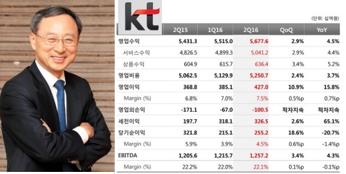 황창규 회장은 `통신 본업 경쟁력 강화`와 `그룹사간 시너지`를 강조해왔다. 이에 KT는 올 2분기 5조 6776억 원의 매출을 통해 4270억원의 영업이익을 거뒀다. 이는 1분기에 비해 매출은 2.9%, 영업이익은 10.9% 개선된 수치다. 지난해 같은 기간 실적과 비교시에도 매출과 영업이익 모두 각각 4.5%, 15.8% 증가세를 나타냈다.