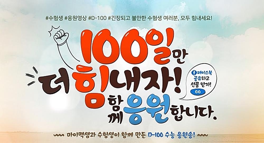 디지털대성이 운영하는 온라인 대입 브랜드 대성마이맥이 수능 D-100을 맞아 수험생에게 힘을 주고자 ‘수능 응원송’을 만들었습니다. 수험생과 대성마이맥 선생님들이 직접 참여해 가사를 만들었으며, 제작 전 ‘함께 만드는 D-100 응원송’ 이벤트를 통해 수험생들에게 가사와 사진을 응모받고 이 중 선정된 가사에 곡을 붙였습니다. 사진은 뮤직비디오로 제작됐습니다. 국어 박광일, 영어 이명학, 수학 한석원 등 24명의 강사들이 수험생에게 전하는 응원메시지도 함께 공개했다고 합니다.