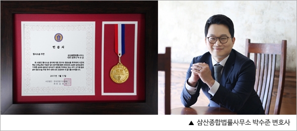 최근 (사)한국전문기자협회는 삼산종합법률사무소의 박수준 대표변호사를 `법조-형사소송` 부문 우수변호사로 선정하여 인증서를 수여했다. 이에 박수준 변호사는 "그동안 성범죄 등 다양한 형사범죄와 형사소송에서 억울한 이들을 위해 법률서비스를 제공해왔다"면서, "앞으로도 치밀한 법리분석과 증거확보 등으로 의뢰인의 소중한 권리를 보호할 것"이라고 소감을 전했다.