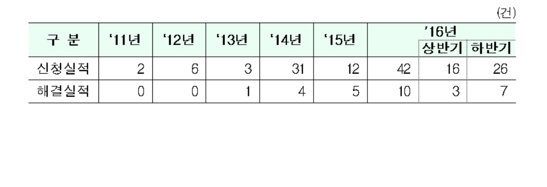 2011년 이후 2년 간 한 건도 없던 분쟁조정 해결 건수도 2013년 1건, 2014년 4건, 2015년 5건에 이어 지난해에는 10건으로 크게 증가했습니다.