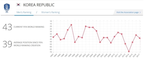 한국 축구가 6월 국제축구연맹(FIFA) 랭킹에서 지난달과 같은 43위를 유지했다.