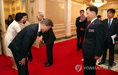 문재인 대통령이 15일 낮 청와대 영빈관에서 열린 `국가유공자 및 보훈가족을 위한 따뜻한 오찬` 행사에서 한 참석자가 경례하자 허리숙여 답례를 해 화제가 되고 있다.