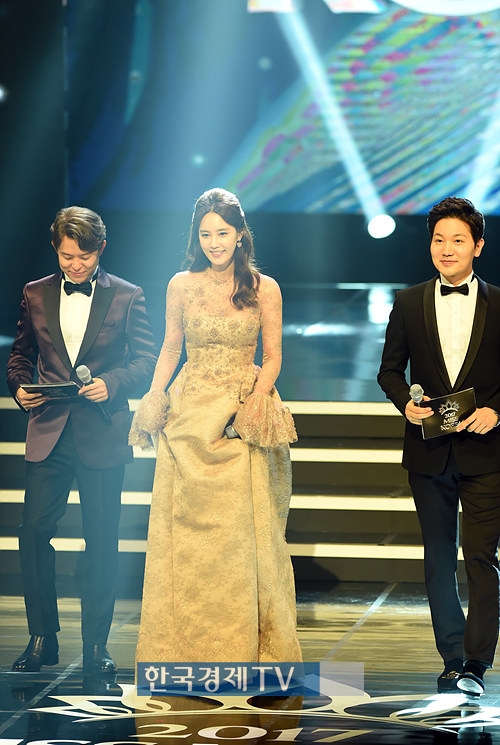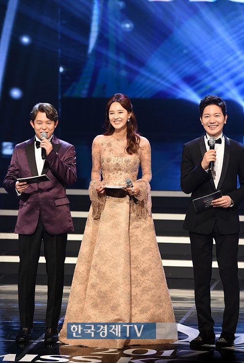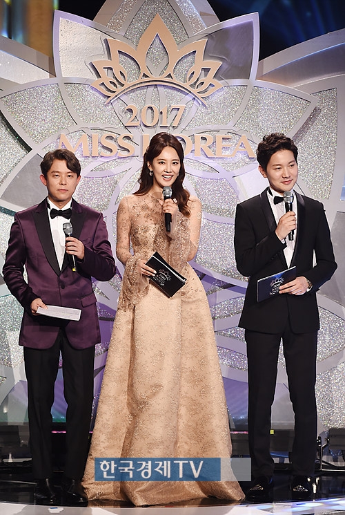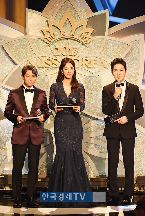 가수 토니안, 1989년 미스코리아 진 출신 배우 오현경, 김정근 아나운서가 7일 오후 8시 서울 광진구 유니버설아트센터에서 열린 `2017 미스코리아 선발대회`에서 사회를 보고 있다.