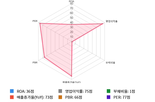 그리고 수익성(영업이익률) 역시 도드라지는 편이다. 수익성 점수는 75점으로 두번째로 높은 점수를 기록했다.