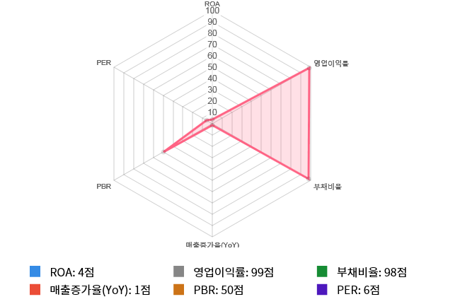 그리고 안정성(부채비율) 역시 도드라지는 편이다. 안정성 점수는 98점으로 두번째로 높은 점수를 기록했다.