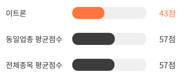 AI 인공지능 분석을 통한 이트론의 종목 종합 스코어는 43점을 기록했다.