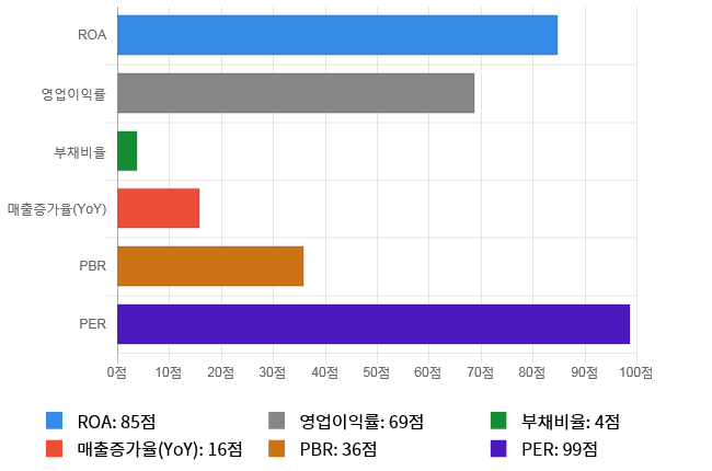그리고 효율성(ROA) 역시 도드라지는 편이다. 효율성 점수는 85점으로 두번째로 높은 점수를 기록했다.