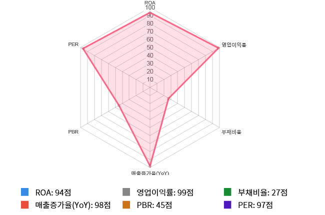 그리고 성장성(매출증가율(YoY)) 역시 도드라지는 편이다. 성장성 점수는 98점으로 두번째로 높은 점수를 기록했다.