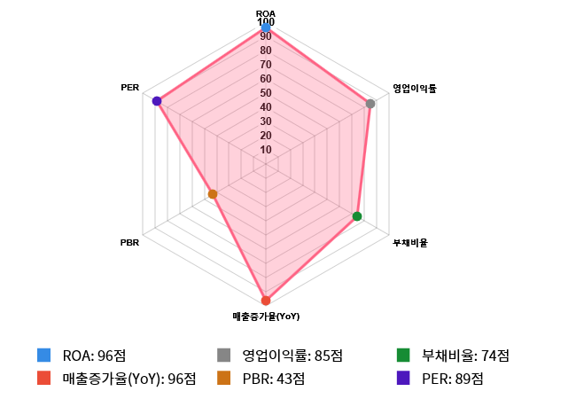 그리고 성장성(매출증가율(YoY)) 역시 도드라지는 편이다. 성장성 점수는 95점으로 두번째로 높은 점수를 기록했다. 매출증가율(YoY)는 전체 시장 내 82위를 기록하며 상위 4.5%에 위치했다. 업종별로는 12위를 기록하며 상위 3.5%에 위치했다.