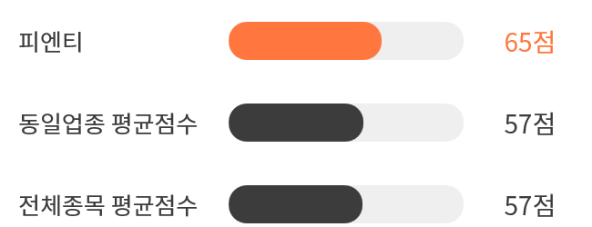 AI 인공지능 분석을 통한 피엔티의 종목 종합 스코어는 65점을 기록했다.