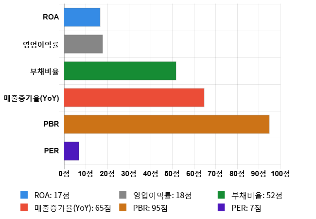 그리고 성장성(매출증가율(YoY)) 역시 도드라지는 편이다. 성장성 점수는 65점으로 두번째로 높은 점수를 기록했다. 매출증가율(YoY)은 전체 시장 내 638위를 기록하며 상위 35.41%에 위치했다. 업종별로는 94위를 기록하며 상위 42.27%에 위치했다.