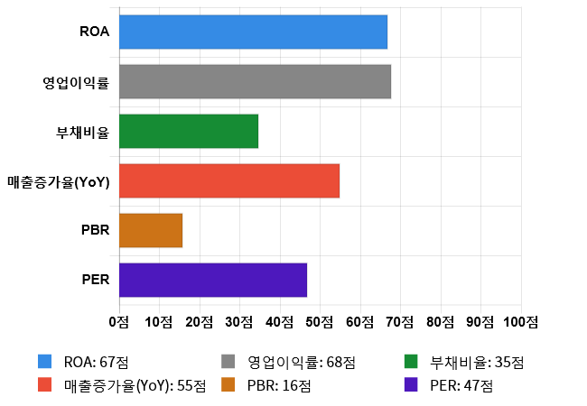 그리고 효율성(ROA) 역시 도드라지는 편이다. 효율성 점수는 67점으로 두번째로 높은 점수를 기록했다. ROA은 전체 시장 내 629위를 기록하며 상위 32.69%에 위치했다. 업종별로는 231위를 기록하며 상위 40.56%에 위치했다.